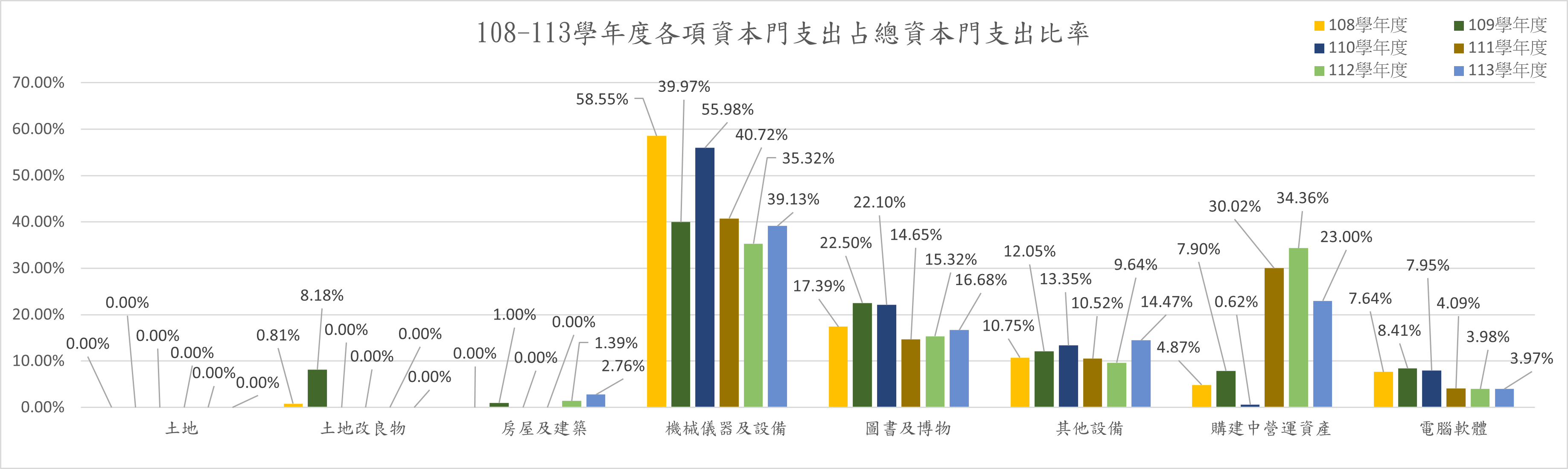 註: 本校108-110學年度資本支出主要投入於機械儀器設備,以及圖書館之圖書、電子期刊及資料庫等,111-113學年度主要投入於機械儀器設備及購建中營運資產。近108-110學年度,機械儀器及設備平均為2,386萬元,圖書及博物平均為943萬元;111-113學年度機械儀器及設備平均為2,431萬元,購建中營運資產平均為1,847萬元,均占當學年總資本門支出約六成。